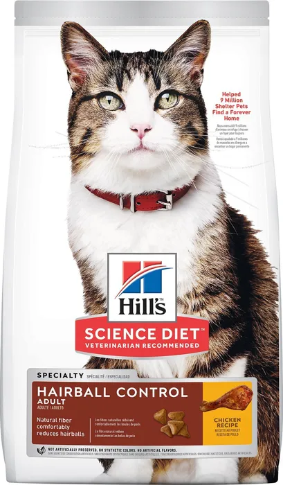 Hill's Science Diet Adult Hairball Control Dry Cat Food provides your four-legged friend with great tasting nutrition for a long, happy life. Made with wholesome ingredients such as savory chicken, this nourishing recipe is balanced to meet your pet's needs, reduce occurrence of hairballs, and promote a healthy body weight. Manufactured in the United States, every ingredient meets strict requirements for purity and nutrient content which exceed industry standards. Formulated for adult cats 1 to 6 years of age who are prone to hairballs, this Hill's Science Diet provides your cat the nutrition she needs for a lifetime of health and happiness.
