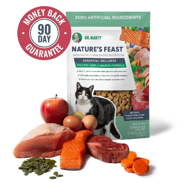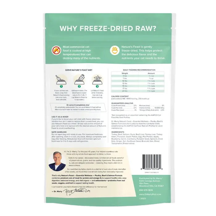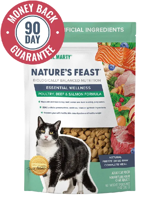 Dr. Marty Nature's Feast Essential Wellness Cat Food, is a premium, freeze-dried raw cat food that provides everything your adult cat needs for a stronger, healthier life. This cat food formula is 100% natural and contains feline-friendly fruits, veggies, and mixed proteins to support energy, good digestion, and smooth skin (and a shinier coat!).