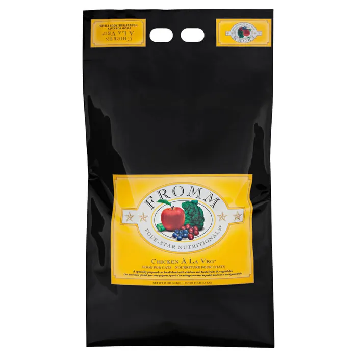 Keeping the needs of your cat in mind, Fromm Four Star Chicken A La Veg Dry Cat Food is made to support the all breeds in all stages of life. Made with high amounts of protein and paired with fresh produce including broccoli and carrots to provide high quality, easily digestible carbohydrates. Fromm Four Star Chicken A La Veg Dry Cat Food provides well rounded, balanced nutrition for your furry friend without the unnecessary fillers! This recipe also supports the health of your cat‰ۡó»s coat and skin with guaranteed levels of Omega fatty acids and is enhanced with probiotics to ensure that their digestion is right on track! Fromm Four Star Chicken A La Veg Dry Cat Food is made with quality ingredients found in the United States with no artificial colors, flavors, or preservatives that any cat is sure to love!