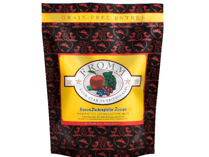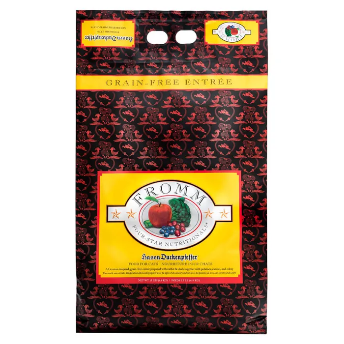 Keeping the needs of your cat in mind, Fromm Four Star Game Bird Dry Cat Food is made to support all breeds and sizes. Made with high quality protein including duck and turkey paired with farm fresh fruits and vegetables, Fromm Four Star Game Bird Dry Cat Food provides well rounded, balanced nutrition for your furry friend without the unnecessary fillers! This recipe also supports the health of your cat‰ۡó»s coat and skin with guaranteed levels of Omega fatty acids and is enhanced with probiotics to ensure that their digestion is right on track! Fromm Four Star Game Bird Dry Cat Food is made with quality ingredients found in the United States with no artificial colors, flavors, or preservatives that any cat is sure to love!
