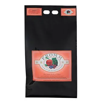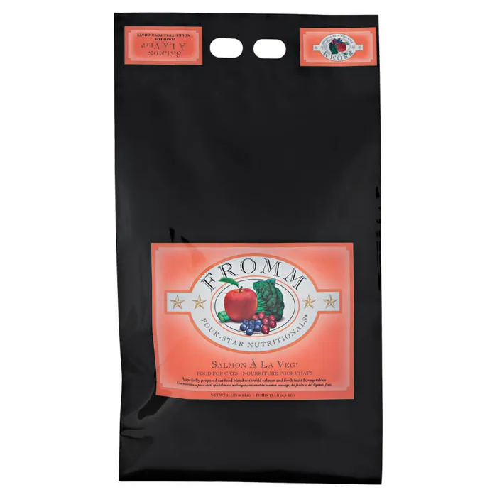 Keeping the needs of your cat in mind, Fromm Four Star Salmon A La Veg Dry Cat Food is made to support all breeds in all stages of life. Made with high amounts of protein paired with fresh produce including sweet potatoes, broccoli, apples, and carrots to provide high quality, easily digestible carbohydrates. Fromm Four Star Salmon A La Veg Dry Cat Food provides well rounded, balanced nutrition for your furry friend without the unnecessary fillers! This recipe also supports the health of your cat‰ۡó»s coat and skin with guaranteed levels of Omega fatty acids and is enhanced with probiotics to ensure that their digestion is right on track! Fromm Four Star Salmon A La Veg Dry Cat Food is made with quality ingredients found in the United States with no artificial colors, flavors, or preservatives that any cat is sure to love!