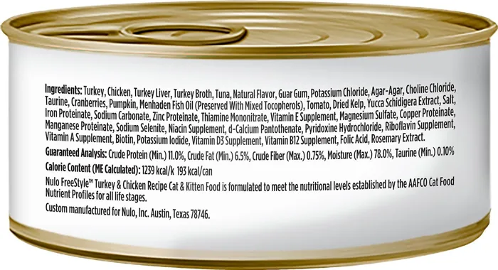 Give your cat a meal made with premium ingredients you can trust with Nulo's Freestyle Turkey & Chicken Recipe Grain-Free Canned Cat & Kitten Food! This feline formula is crafted with real turkey as the very first ingredient, followed by chicken, turkey liver and tuna for the high-quality protein your pet needs to fuel her muscles. She will love the texture of every tender bite and the irresistible taste of the lip-smacking gravy. And while you won't find any grains, corn, wheat or anything artificial in this palatable pate, you will find superfoods like cranberries, kelp and pumpkin, vitamins, minerals, healthy omegas and taurineย --an amino acid that helps support your cat's overall health. Just pop open a can with the easy-pull tab and watch your cat purr with approval!