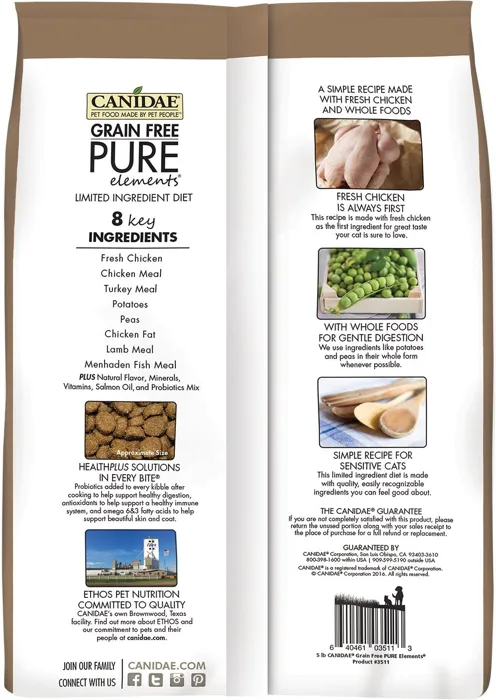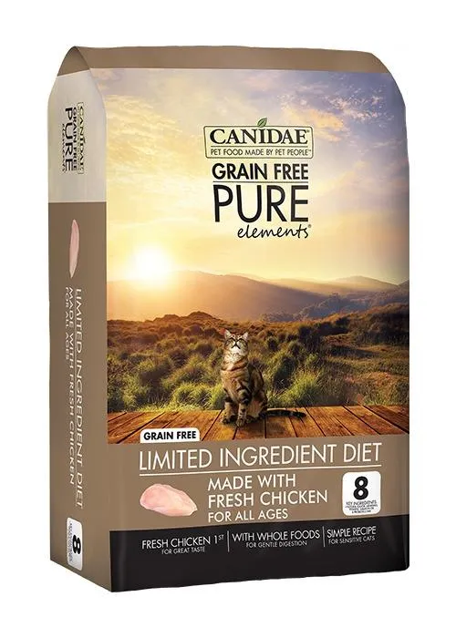 Keep things deliciously simple with the CANIDAE Grain-Free PURE Elements with Chicken Limited Ingredient Diet Dry Cat Food. Using a simple recipe for sensitive cats, this limited-ingredient diet is made with just 8 key ingredients - and even if your cat isn't sensitive to ingredients, he'll still love the great taste. The recipe starts with real chicken as the first ingredient, and then it's paired with whole foods for gentle digestion, and never any corn, wheat or soy. Feed your cat all the great taste he craves and all the nutrition he needs.