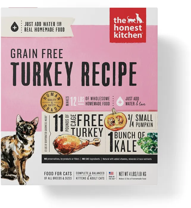 - Complete and balanced dehydrated grain-free cat food made with dehydrated cage-free turkey, vegetables, fruits and love