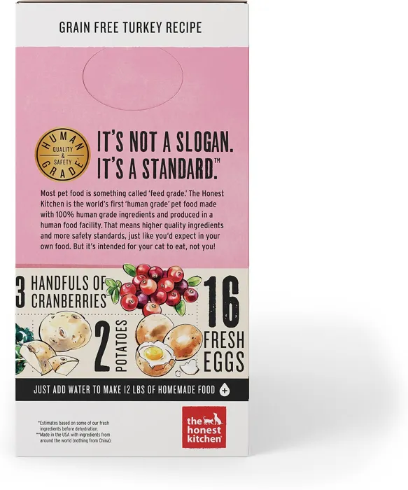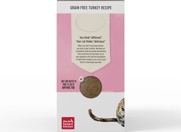 The Honest Kitchen Grain-Free Turkey Recipe Dehydrated Cat Food is packed with 70%, free-range turkey, making it perfect for adult and senior kitties. It's a less-processed, high-moisture alternative to canned food, bursting with natural, whole-food goodness. Plus, it delivers complete and balanced nutrition for adult cats of all breeds.