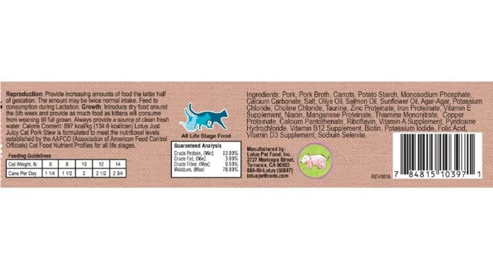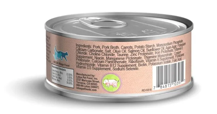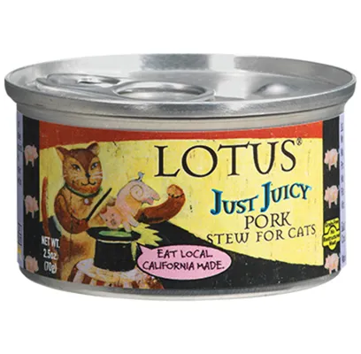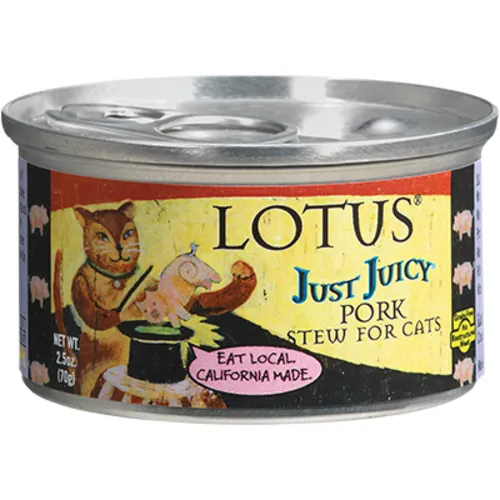 This Just Juicy Pork Stew by Lotus contains 95% meat, which makes it the purr-fect recipe to suit your little carnivore's natural desire for a protein-rich meal. Made with real pork as the very first ingredient and pork broth for lip-smacking moisture, this grain-free stew is sure to satisfy any kitty's cravings. These meals are hand packed in California into cans with non-BPA lining and are 100% free of carrageenan, guar gum and xanthan gum. Lotus is a family owned and operated business that's dedicated to crafting food you can feel good about giving your feline friend!