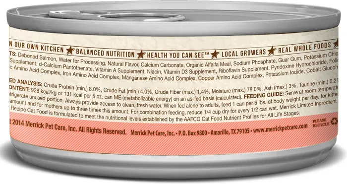 Give your sensitive kitty the simple nutrition he needs with the Merrick Limited Ingredient Diet Grain-Free Real Salmon Pate Recipe Canned Cat Food. It's packed with high-protein, tender salmon as the first ingredient and only animal protein source, and prepared into a whisker-licking pate even picky eaters love. Loaded with antioxidants to support immunity, omegas for a healthy skin and coat, plus vitamins, minerals and taurine in every bite, it's sure to fuel all your kitty's adventures, and then yum! Plus, it has zero grains, artificial colors, flavors or preservatives so you can let kitty dive right into his bowl every time.