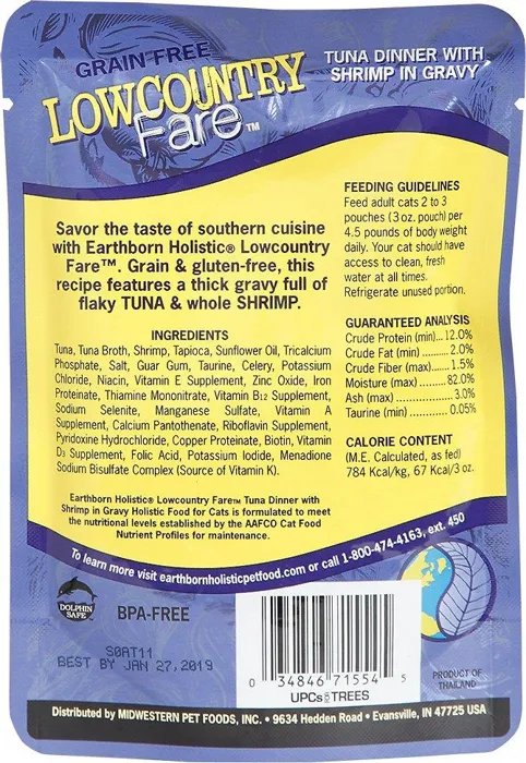 Let your pal savor the taste of southern cuisine with the Earthborn Holistic Lowcountry Fare Tuna Dinner with Shrimp in Gravy Grain-Free Cat Food Pouches. It combines tasty proteins including flaked tuna and whole shrimp as the top ingredients to provide plenty of muscle-nourishing protein in every bite. With zero gluten or grains, this holistic feast is purr-fect for fueling all those adventures since it's loaded with vitamins, minerals and essential taurine. Plus, it's made with real broth to keep your pal hydrated and support his urinary health. Just tear the pouch and serve up, as a meal on its own or a delicious kibble topper even picky eaters will dive into.