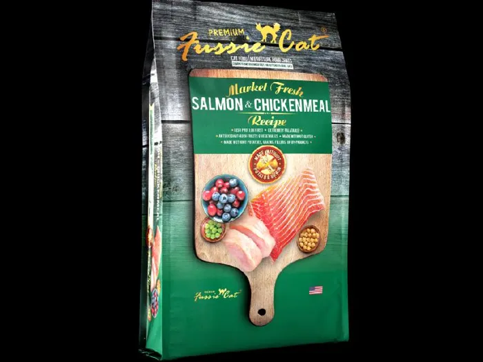 Fussie Cat Market Fresh Salmon & Chicken Recipe Dry Cat Food is created with the freshest and finest ingredients for your feline family member. Cats are notoriously fussy when it comes to their food and require a diet based on animal proteins to truly thrive. That's why Fussie Cat tailors the taste of each recipe based on actual feline feedback to ensure it's equally delicious. This Physiologically Tuned and grain-free recipe features real salmon and chicken as the first ingredients to provide complete, high-quality protein and an excellent source of vitamin B12, vitamin B6 and both Omega-3 and Omega-6 fatty acids.