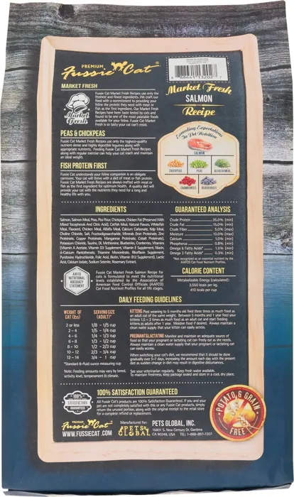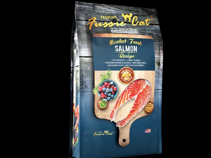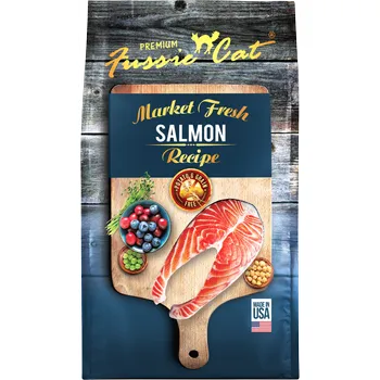Fussie Cat Market Fresh Salmon Recipe Dry Cat Food is created with the freshest and finest ingredients for your feline family member. Cats are notoriously fussy when it comes to their food and require a diet based on animal proteins to truly thrive. That's why Fussie Cat tailors the taste of each recipe based on actual feline feedback to ensure it's equally delicious. This Physiologically Tuned and grain-free recipe features real salmon as the first ingredient to provide complete, high-quality protein and an excellent source of vitamin B12 and both Omega-3 and Omega-6 fatty acids.