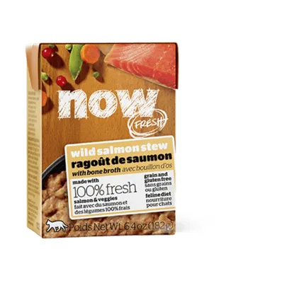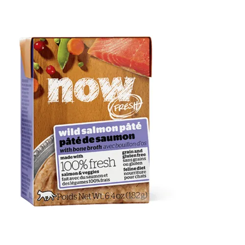 NOW FRESH Grain Free Wild Salmon Pฬขtฬฉ with bone broth is made with 100% FRESH salmon and 100% fresh Omega 3 & 6 oils from coconuts and canola. NOW FRESHโฐรฃยข also features zero grains, gluten, wheat, beef, corn or soy. Zero rendered meats, by-products or artificial preservatives.