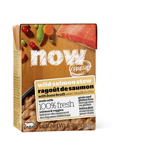 NOW FRESH Grain Free Wild Salmon Stew with bone broth is made with 100% FRESH salmon and 100% fresh Omega 3 & 6 oils from coconuts and canola. NOW FRESHโฐรฃยข also features zero grains, gluten, wheat, beef, corn or soy. Zero rendered meats, by-products or artificial preservatives.
