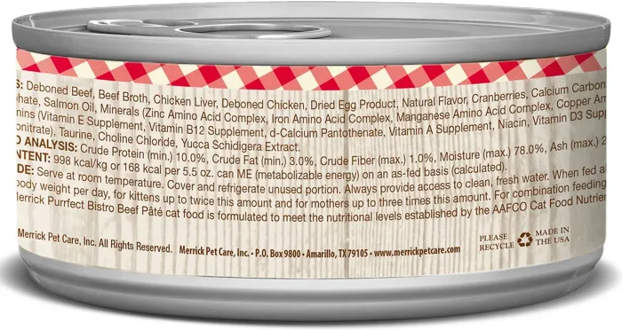 Serve up some bistro-inspired yumminess for your pal with the Merrick Purrfect Bistro Beef Pate Grain-Free Canned Cat Food. It's packed with high-protein, tender beef and chicken, mixed with tasty organic alfalfa and cranberries, and cooked in whisker-licking, hydrating gravy. Loaded with antioxidants to support immunity, omegas for a healthy skin and coat, plus vitamins, minerals and taurine in every bite, it's sure to fuel all your kitty's adventures, and then yum! Plus, it has zero grains, artificial colors, flavors or preservatives so you can let kitty dive right into his bowl.