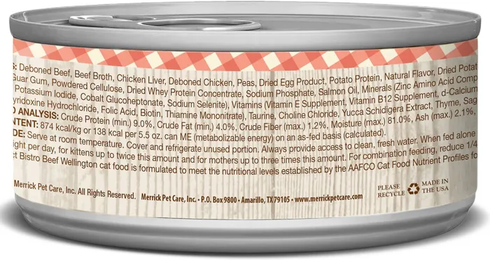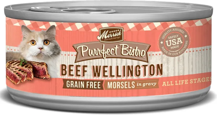 Serve up the kitty version of a classic culinary favorite for your pal with the Merrick Purrfect Bistro Grain-Free Beef Wellington Morsels in Gravy Canned Cat Food. It's packed with high-protein morsels of beef and chicken, mixed with tasty potatoes and peas, and cooked in whisker-licking, hydrating gravy. Loaded with antioxidants to support immunity, omegas for a healthy skin and coat, plus vitamins, minerals and taurine in every bite, it's sure to fuel all your kitty's adventures, and then yum! Plus, it has zero grains, artificial colors, flavors or preservatives so you can let kitty dive right into his bowl.