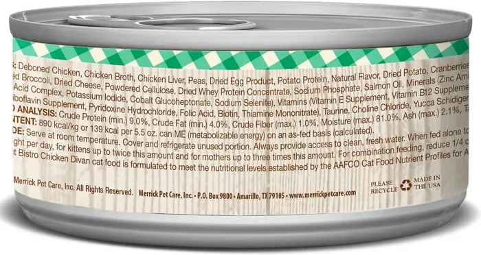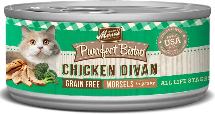 Serve up the kitty version of a classic culinary favorite for your pal with the Merrick Purrfect Bistro Grain-Free Chicken Divan Morsels in Gravy Canned Cat Food. It's packed with high-protein morsels of chicken, mixed with tasty potatoes and peas, and cooked in whisker-licking, hydrating gravy. Loaded with antioxidants to support immunity, omegas for a healthy skin and coat, plus vitamins, minerals and taurine in every bite, it's sure to fuel all your kitty's adventures, and then yum! Plus, it has zero grains, artificial colors, flavors or preservatives so you can let kitty dive right into his bowl.