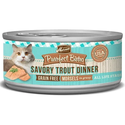 Serve up some bistro-inspired yumminess for your pal with the Merrick Purrfect Bistro Grain-Free Morsels in Gravy Savory Trout Dinner Canned Cat Food. It's packed with high-protein, tender trout as the first ingredient, purrfectly cooked and mixed with fresh veggies and a whisker-licking, hydrating gravy. Loaded with antioxidants to support immunity, omegas for a healthy skin and coat, plus vitamins, minerals and taurine in every bite, it's sure to fuel all your kitty's adventures, and then yum! Plus, it has zero grains, artificial colors, flavors or preservatives so you can let kitty dive right into his bowl every time.