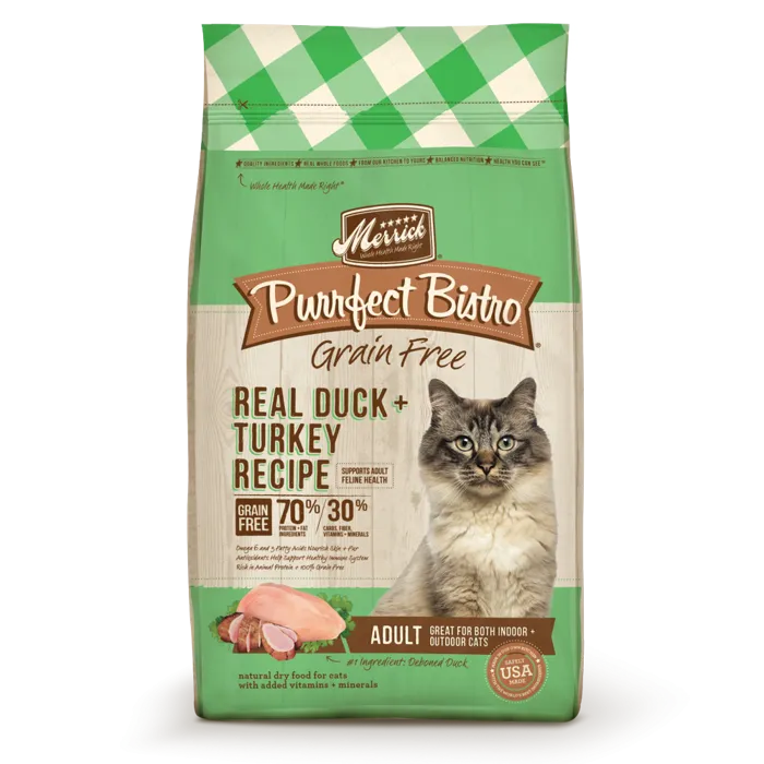 Merrick Purrfect Bistro Grain Free Real Duck and Turkey Dry Cat Food provides balanced nutrition using real whole foods sourced from local farmers. Cats thrive on a grain-free, protein rich diet with minimal fat and low carbohydrates. This delicious, nutrient rich food is perfect for cats of all ages. Merrick Purrfect Bistro Grain Free Real Duck and Turkey Dry Cat Food starts with real, deboned duck to help make up the 70% protein content from meat sourced ingredients! As with all of Merricks recipes, it's made with no artificial colors, flavors, or preservatives and contains absolutely no by-products.
