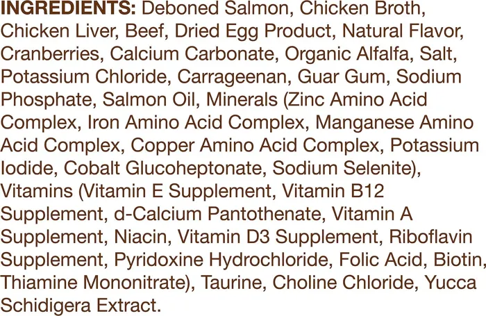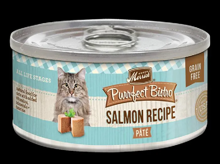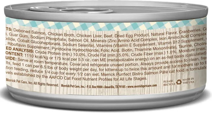 Serve up some bistro-inspired yumminess for your pal with the Merrick Purrfect Bistro Grain-Free Salmon Pate Canned Cat Food. It's packed with high-protein, savory salmon as the first ingredient, mixed with tasty organic alfalfa and cranberries, and cooked in whisker-licking, hydrating gravy. Loaded with antioxidants to support immunity, omegas for a healthy skin and coat, plus vitamins, minerals and taurine in every bite, it's sure to fuel all your kitty's adventures, and then yum! Plus, it has zero grains, artificial colors, flavors or preservatives so you can let kitty dive right into his bowl.