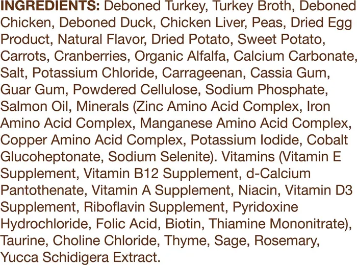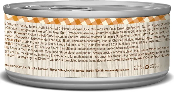 Serve up the kitty version of all the fixings for your pal with the Merrick Purrfect Bistro Grain-Free Thanksgiving Day Dinner Minced in Gravy Canned Cat Food. It's packed with high-protein, tender turkey, mixed with tasty sweet potatoes, cranberries and peas, and cooked in whisker-licking, hydrating gravy. Loaded with antioxidants to support immunity, omegas for a healthy skin and coat, plus vitamins, minerals and taurine in every bite, it's sure to fuel all your kitty's adventures, and then yum! Plus, it has zero grains, artificial colors, flavors or preservatives so you can let kitty dive right into his bowl.