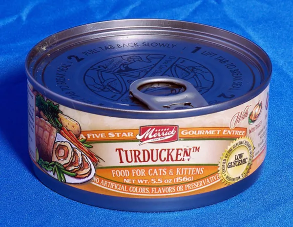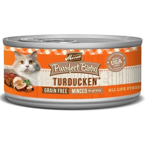 Serve up the kitty version of all the holiday fixings for your pal with the Merrick Purrfect Bistro Grain-Free Turducken Minced in Gravy Canned Cat Food. It's packed with high-protein, tender turkey, chicken and duck mixed with tasty sweet potatoes, cranberries and peas, and cooked in whisker-licking, hydrating gravy. Loaded with antioxidants to support immunity, omegas for a healthy skin and coat, plus vitamins, minerals and taurine in every bite, it's sure to fuel all your kitty's adventures, and then yum! Plus, it has zero grains, artificial colors, flavors or preservatives so you can let kitty dive right into his bowl.