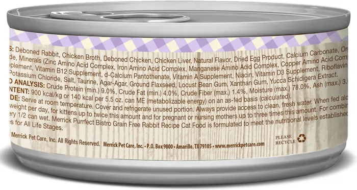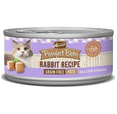 Serve up some bistro-inspired yumminess for your pal with the Merrick Purrfect Bistro Rabbit Pate Grain-Free Canned Cat Food. It's packed with high-protein, tender rabbit as the first ingredient, mixed with tasty organic alfalfa and cranberries, and cooked in whisker-licking, hydrating gravy. Loaded with antioxidants to support immunity, omegas for a healthy skin and coat, plus vitamins, minerals and taurine in every bite, it's sure to fuel all your kitty's adventures, and then yum! Plus, it has zero grains, artificial colors, flavors or preservatives so you can let kitty dive right into his bowl.
