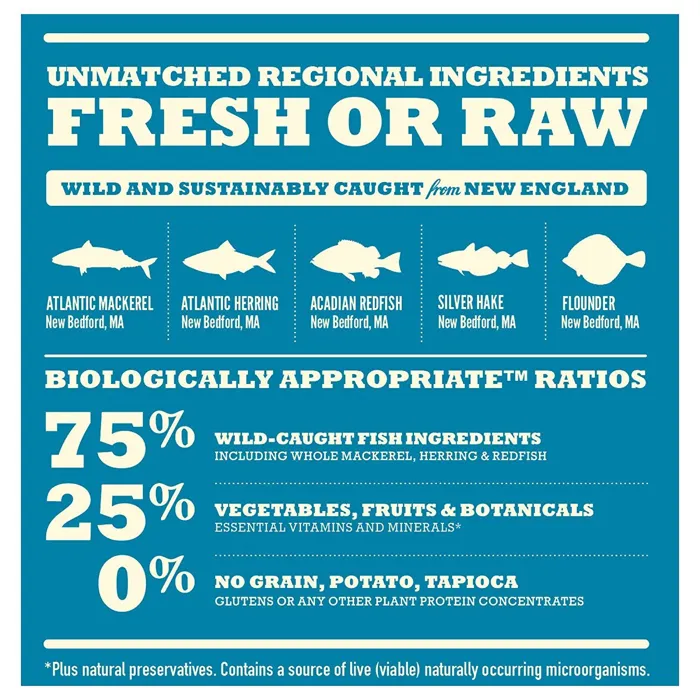 - Regionally inspired dry cat food packed with wild-caught mackerel, herring, redfish, silver hake, and yellowtail flounder