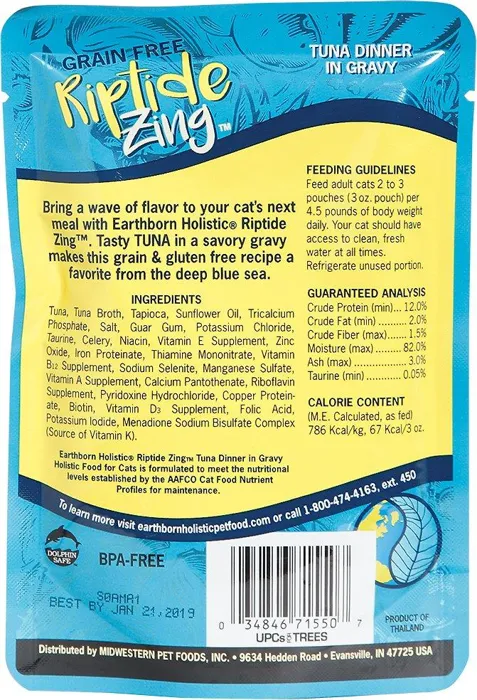Bring a wave of whisker-licking flavor to your kitty's bowl with the Earthborn Holistic Riptide Zing Tuna Dinner in Gravy Grain-Free Cat Food Pouches. It features tuna - the mightiest protein in the deep blue sea - as the first and main ingredient to provide plenty of muscle-nourishing protein in every bite. Cat-abunga! With zero gluten or grains, this beach-side feast is purr-fect for fueling all those adventures since it's loaded with vitamins, minerals and essential taurine. Plus, it's made with real broth to keep your pal hydrated and support his urinary health. Just tear the pouch and serve up, as a meal on its own or a delicious kibble topper even picky eaters will dive into.