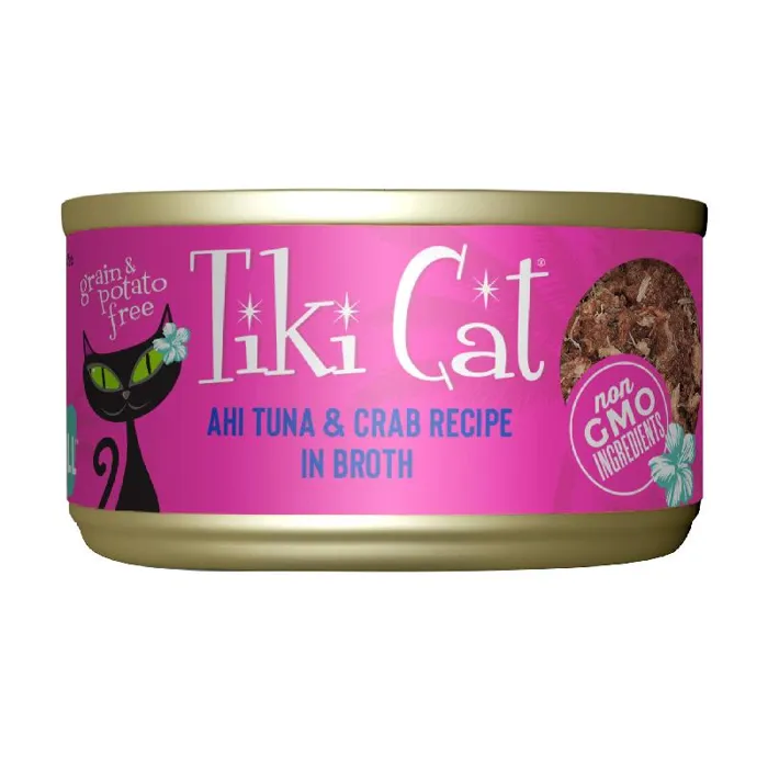 Tiki Cat Gourmet Whole Food Brand Cat Food Hana Luau is shredded Ahi Tuna topped with Crab prepared in Tuna consommรญยฉ for a grain free, gravy free, zero carb meal. Complete and balanced diet for all life stages