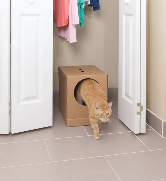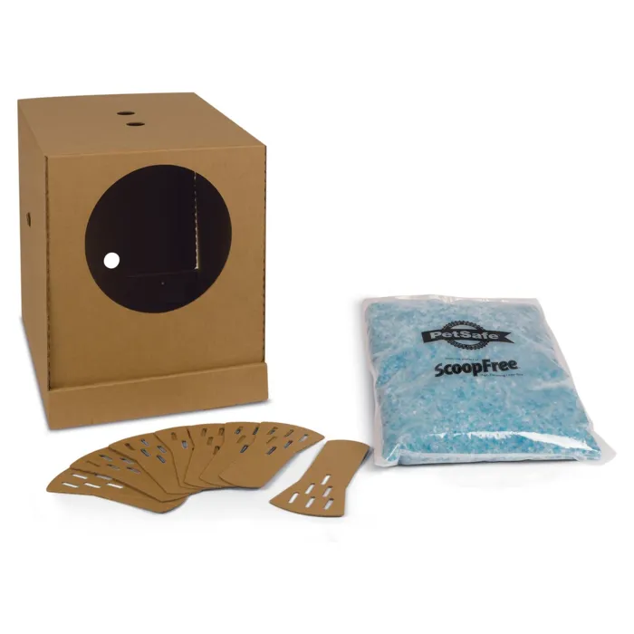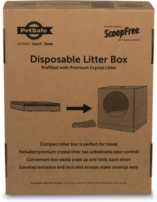 The PetSafeยฎ Disposable Litter Box is made of durable corrugated cardboard. The compact litter box easily pops up and folds back down for travel convenience. The box comes with a bag of crystal litter which absorbs urine and dries solid waste for 5x better odor control than clumping clay litters. The protective coating on the box protects against leaks while the box nests snuggly in the lid for extra protection. Whether youโre moving or taking your pet on vacation, this litter box is a convenient potty solution for a pet on the move.