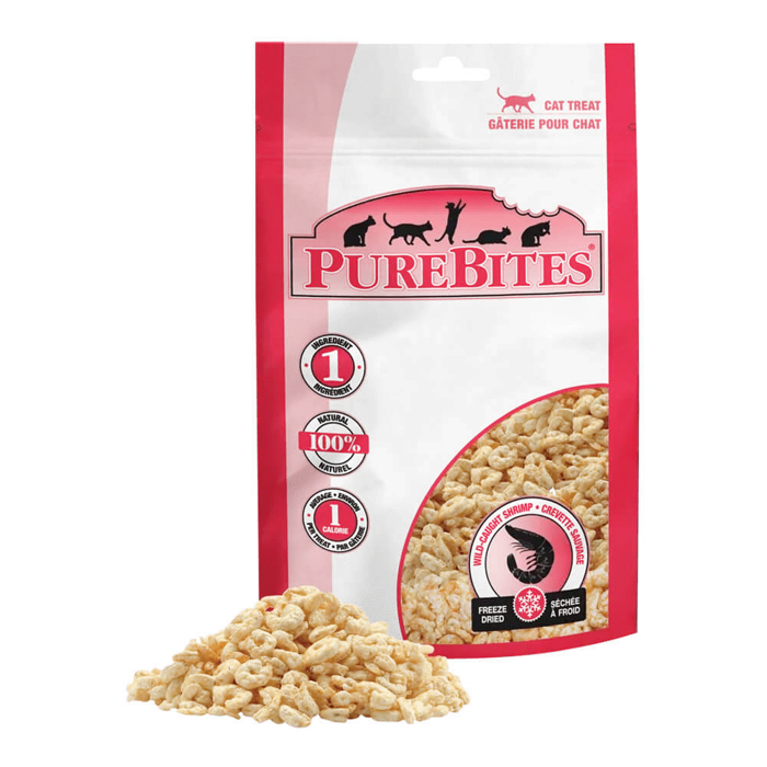 Treat your feline friend to the tender and nutritious PureBites Shrimp Freeze-Dried Raw Cat Treats. Featuring just one ingredientโwild-caught shrimpโtheyโre 100% pure and natural. Made by using a delicate freeze-drying process, which removes the water, but preserves the raw nutrients, aroma, flavor, texture and freshness your cat craves. Theyโre naturally high in protein and only one calorie per treat. And because they only include one ingredient, theyโre great for cats on a limited-ingredient diet and cats with food sensitivities.