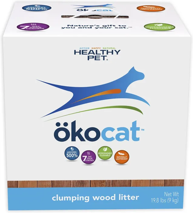 - It also has the added benefit of being biodegradable. Okocat is naturally lightweight and comes in a smart compostable package with an easy carry handle and pour spout.