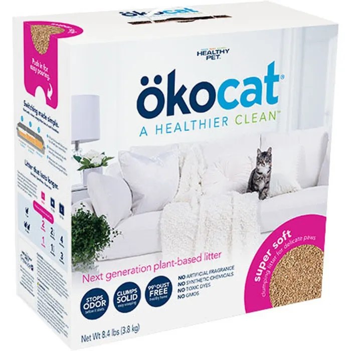 - It also has the added benefit of being biodegradable. Okocat is naturally lightweight and comes in a smart compostable package with an easy carry handle and pour spout.
