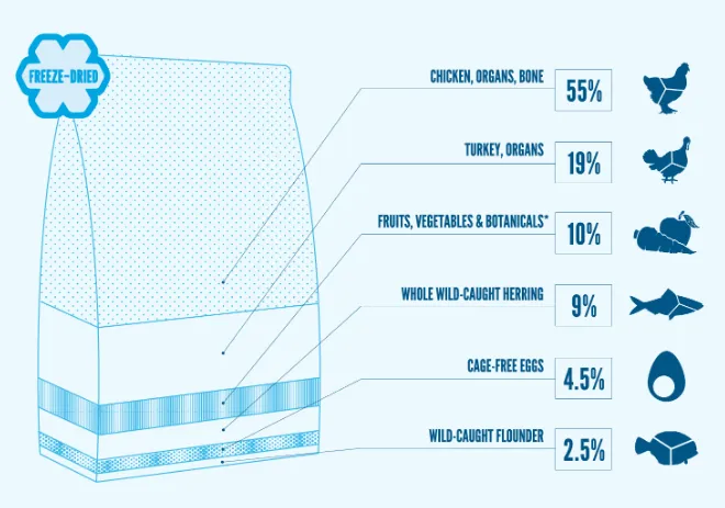 - 90% fresh local meat ingredients, gently freeze dried