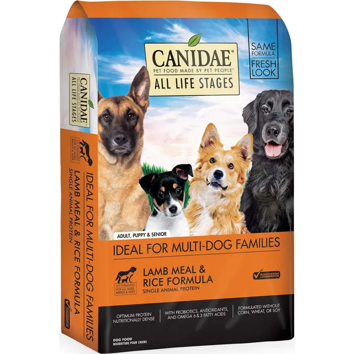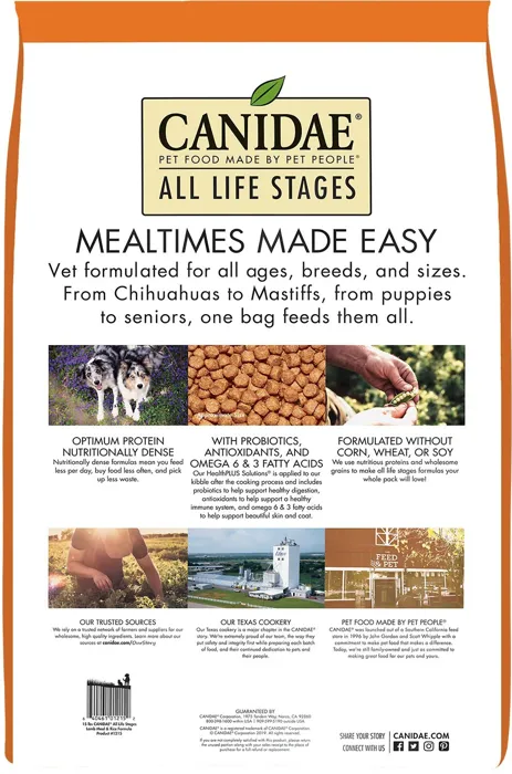 Make mealtimes easy, tasty and nutritious with the CANIDAE Life Stages Lamb Meal & Rice Formula Dry Dog Food. Vet formulated speciโขยcally for all life stages with premium ingredients, optimum protein and zero corn, wheat or soy, this nutritionally dense formula takes a one-recipe-serves-all approach to feeding. That makes mealtimes for multi-dog households much simpler than dealing with multiple bags of different foods. Single-dog households will also enjoy the beneโขยts - no more guessing or switching based on your dog's age, breed, or size. One bag is all you need for the great tasting nutrition they deserve.