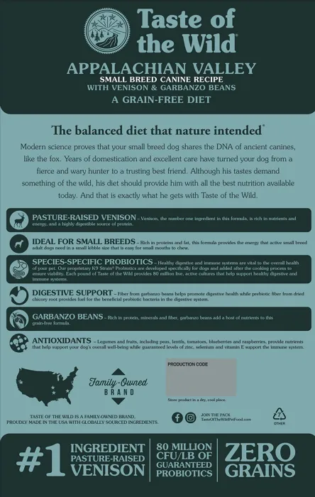 Nourish your small breed canine companion with the balanced diet nature intended with Taste of the Wild Appalachian Valley Small Breed Grain-Free Dry Dog Food! Formulated with novel proteins including venison, this grain-free recipe is made into small-size kibble just for your small breed dog's tummy and teeth. Probiotics and prebiotic fiber help to support healthy digestion, while a blend of venison, lamb, egg, duck and ocean fish proteins provide optimal amino acid nutrition. Rich in proteins and fat, this recipe provides balanced nutrition, the energy that active small dogs need and of course a taste of the wild they constantly crave!
