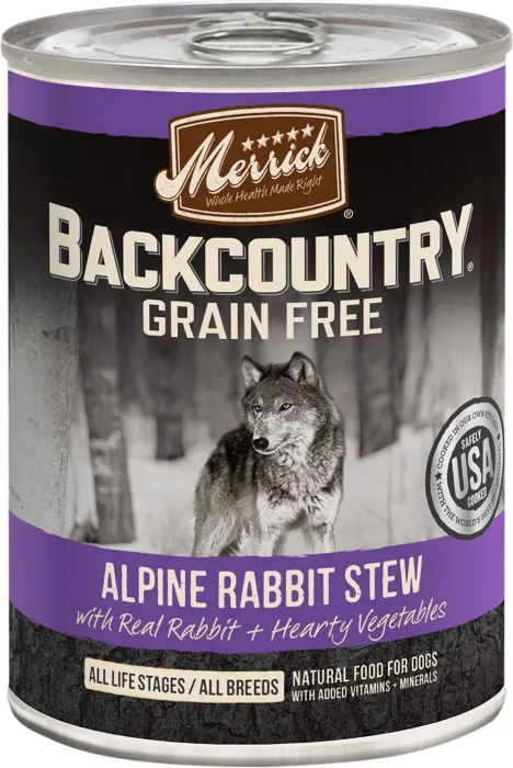 Your carnivorous canine will go wild for Merrick Backcountry Grain-Free Alpine Rabbit Stew Canned Dog Food. This sensational stew offers an irresistible taste variety with a blend of exotic proteins in a hearty meat gravy along with peas, carrots, sweet potatoes and more. Feed your best friend an ancestral diet the way nature intended. And because it's grain-free with no gluten ingredients, it's ideal for the pooch with food allergies or dietary sensitivities. Like all Merrick recipes, this food is cooked right here in the USA!