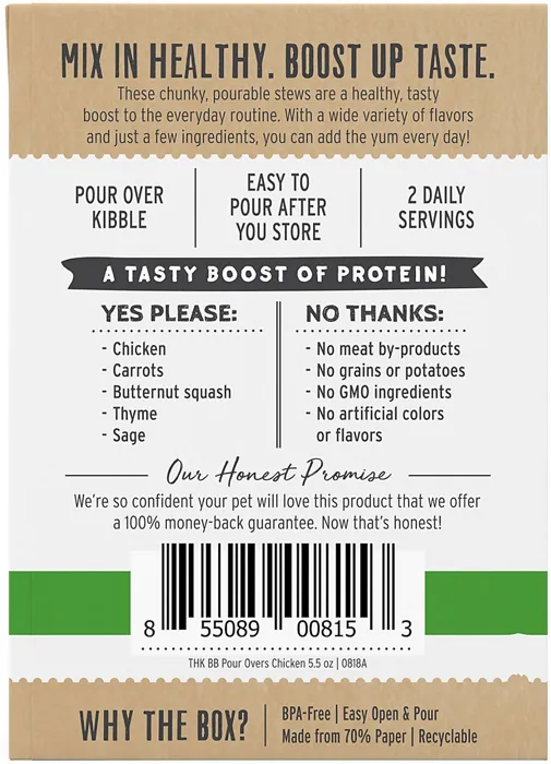 Jazz up your canine's dry dog food with The Honest Kitchen Pour Overs Stew Wet Dog Food Topper. Made with just seven ingredients including chicken bone broth, chicken, carrots and butternut squash, this recipe serves as a delicious and nutritious stew that's pourable too! Every Pour Overs topper is specially designed for intermittent or supplemental feeding only. With a wide variety of flavors to choose from, each slow-cooked stew is grain-free and made with 100% natural ingredients you can trust and all the tail-wagging taste your dog will love!