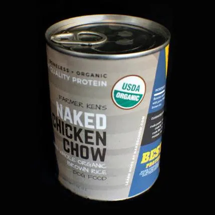 The only ingredients you will find are organic chicken, organic brown rice, omega 3 chicken, pumpkin juices and water Yep! Thatโs it. No gluten, no additives, binders or coloring. Naked Chicken Chow has no antibiotics, no fillers, no guar gum, and no carrageenan. It is simply NAKED.