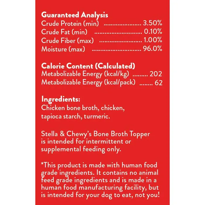 Our all natural bone broth is slowly simmered in small batches and brimming with taste and nutrition. We add real cage-free chicken or grass-fed beef for a taste and topper your dog will go wild for. Serve as a treat or topper to your dogs meal. A perfect solution to hydrate raw food or top kibble at mealtime! Slowly simmered in a USA kitchen 100% human-grade Pet safe: Free from garlic and onions Added turmeric for anti-inflammatory help Single-source animal protein solutions 4 simple ingredients in each recipe