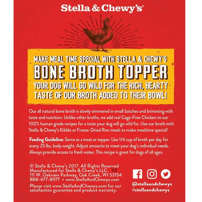 Shake well before using. Use ยผ cup of broth per day for every 25 lbs. body weight. Adjust amounts to meet your dogโs individual needs. Always provide access to fresh water. This recipe is great for dogs of all ages. Refrigerate up to 10 days once opened.
