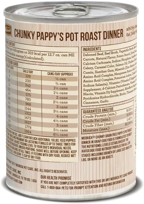 - Merrick Chunky Grain Free Pappy's Pot Roast Dinner Canned Dog Food contains no artificial colors, flavors or preservatives.