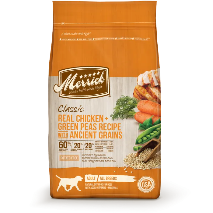 Merrick Classic Real Chicken and Green Peas Recipe with Ancient Grains Dry Dog Food provides natural nutrition from a wholesome balance of protein, whole grains, fruits, and vegetables. Merrick Classic Real Chicken and Green Peas Recipe with Ancient Grains Dry Dog Food starts with real, farm fresh deboned chicken for high quality protein. Fresh produce and a healthy blend of whole grains including ancient grains like quinoa are included. High levels of Omega 6 and Omega 3 fatty acids aid in a healthy skin and coat accompanied with glucosamine and chondroitin to support healthy joints and hips.