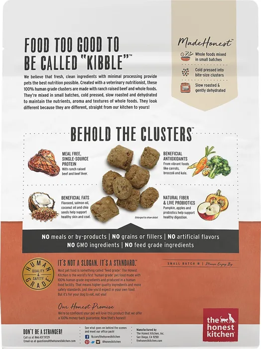 Dogs are family too, which is why they deserve the highest quality nutrition. The Honest Kitchen Grain-Free Beef Clusters Dry Dog Food is too good to be called kibble because it truly stands out from the rest with fresh, clean ingredients and minimal processing. The whole food clusters purposely donโt look like your traditional dry dog food and thatโs because theyโre made in small batches, cold-pressed and then slow-roasted and dehydrated. This process locks in the aroma, nutrients, textures of whole foods like beef, peas, lentils, eggs, carrots and more! So, give your canine companion nutritious and delicious clusters without compromise!