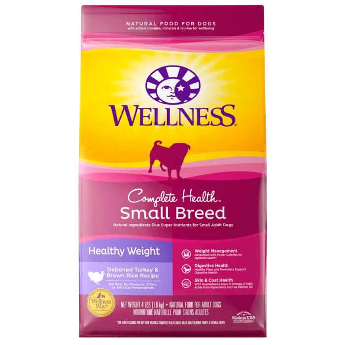 Wellness Complete Health Natural Small Breed Healthy Weight Turkey and Brown Rice Recipe Dry Dog Food is formulated for your small breed dog by using nutrient-dense, high quality ingredients to support their unique health needs! This Complete Health Recipe is packed with antioxidants from fruits and vegetables such as apples, blueberries, spinach, and sweet potatoes. Small breeds need help maintaining lean muscle mass so Wellness uses only high quality animal protein in this recipe, such as deboned Turkey, Chicken Meal, and Salmon Meal. Since it's natural for small breeds to consume less food it's super important they're getting the nutrition they need. This recipe would ensure optimal nutrient absorption meaning less nutrients are being wasted, leading to more nutrients in your small breeds body! This Wellness Complete Health Natural Small Breed Adult Turkey and Brown Rice Recipe Dry Dog Food also makes a really great recipe for Small Breed Senior dogs with slowing metabolisms