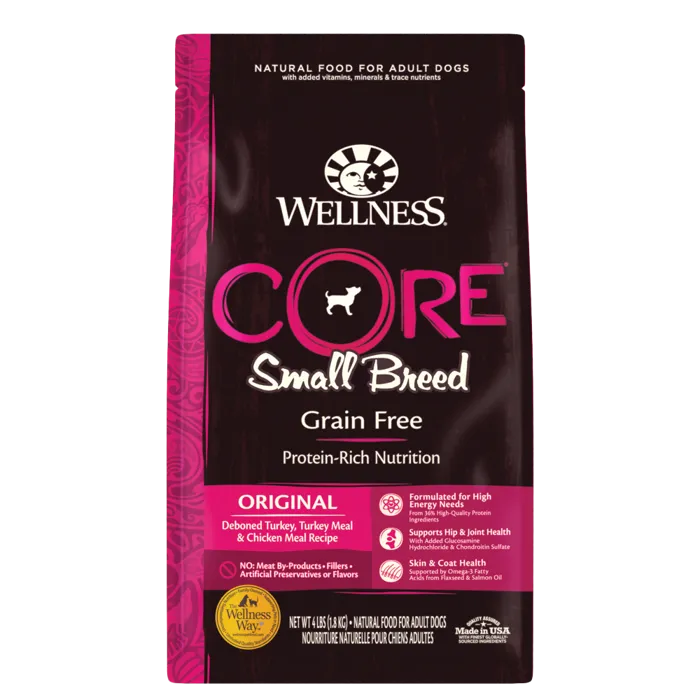 Wellness CORE Grain Free Original Small Breed Recipe is formulated with optimum protein and calorie levels which help support small breeds who tend to have higher energy levels. This recipe has a smaller kibble size to accommodate the smaller mouths of our beloved small breed pets, making it easier for them to eat and enjoy their meals. This nutrient dense recipe includes high quality proteins such as Deboned Turkey, Turkey Meal, and Chicken Meal. In addition, this recipe includes Glucosamine and Chondroitin to help maintain healthy joints and strong bones.