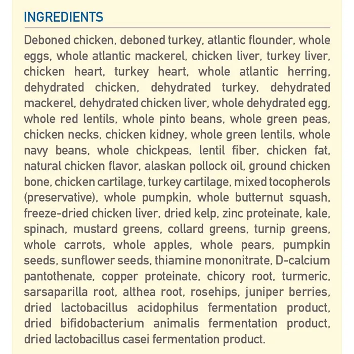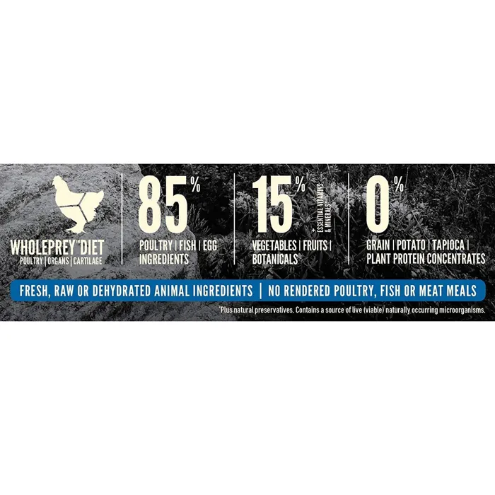 - Offers a rich diversity of fresh and raw meats; 85% meat inclusions, 15% veggies & fruits, and 0% grain, tapioca, or plant protein concentrates