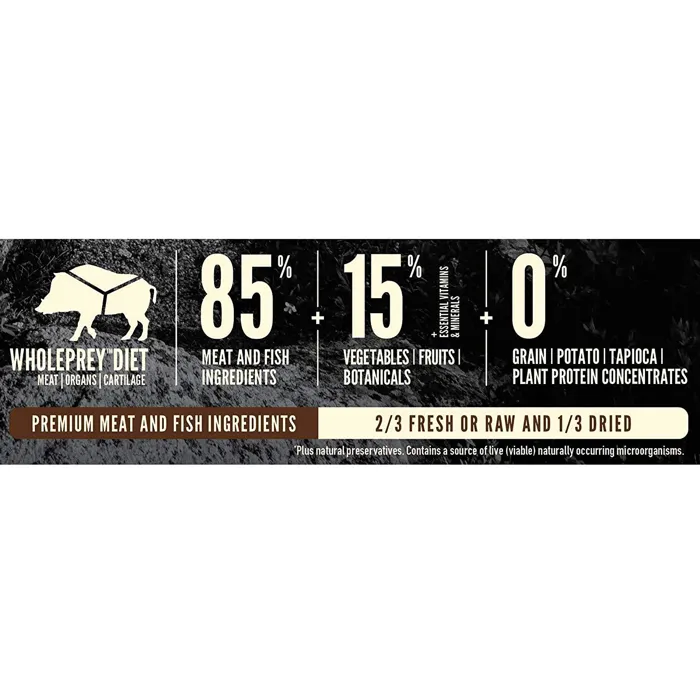 - Offers a rich diversity of fresh and raw meats; 85% meat inclusions, 15% veggies & fruits, and 0% grain, tapioca, or plant protein concentrates