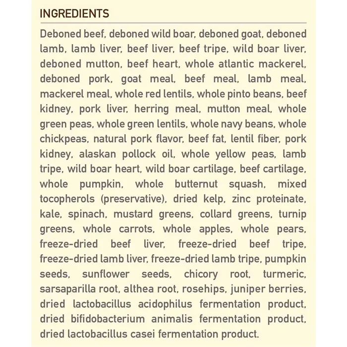 - Offers a rich diversity of fresh and raw meats; 85% meat inclusions, 15% veggies & fruits, and 0% grain, tapioca, or plant protein concentrates