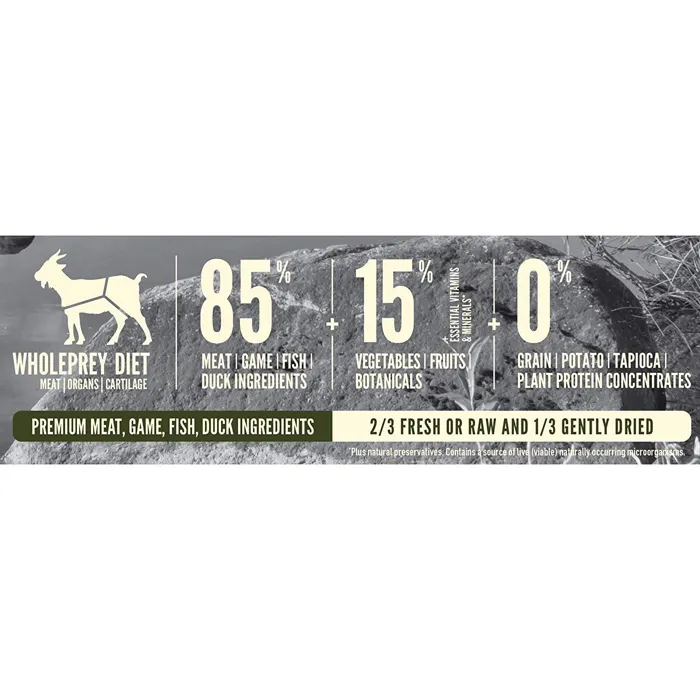 - Offers a rich diversity of fresh and raw meats; 85% meat inclusions, 15% veggies & fruits, and 0% grain, tapioca, or plant protein concentrates