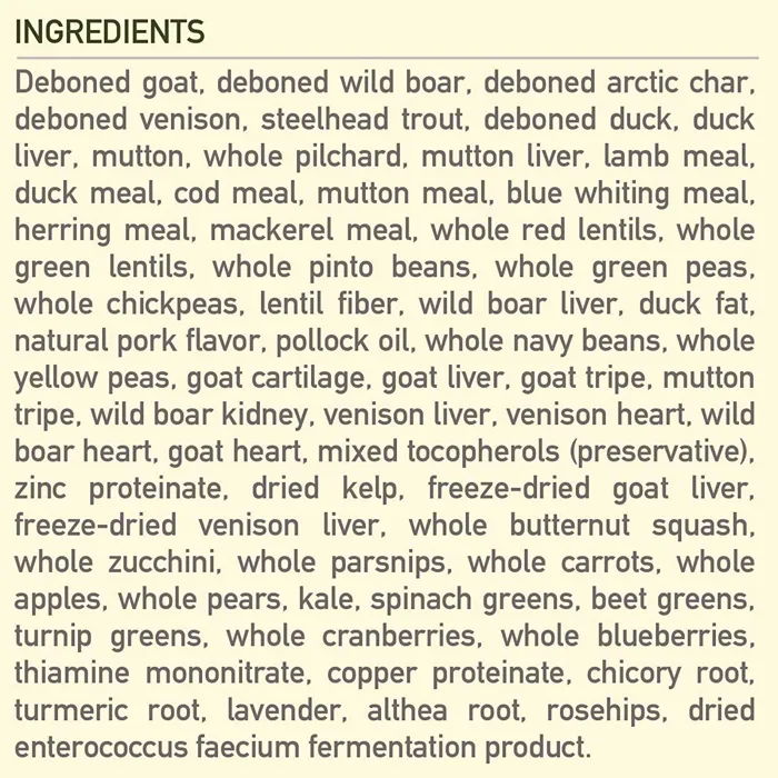 - Nutrient-dense dog food based on the diet dogs evolved to eat; features whole game, fish, fruits, veggies, and grasses